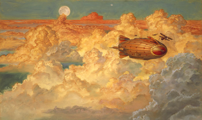 There is a wonderful escapism to Tom Kidd's work. He paints such beautiful worlds of tranquillity and majesty that it makes me wish I could visit and explore them in one of his brilliant looking Zeppelins.
